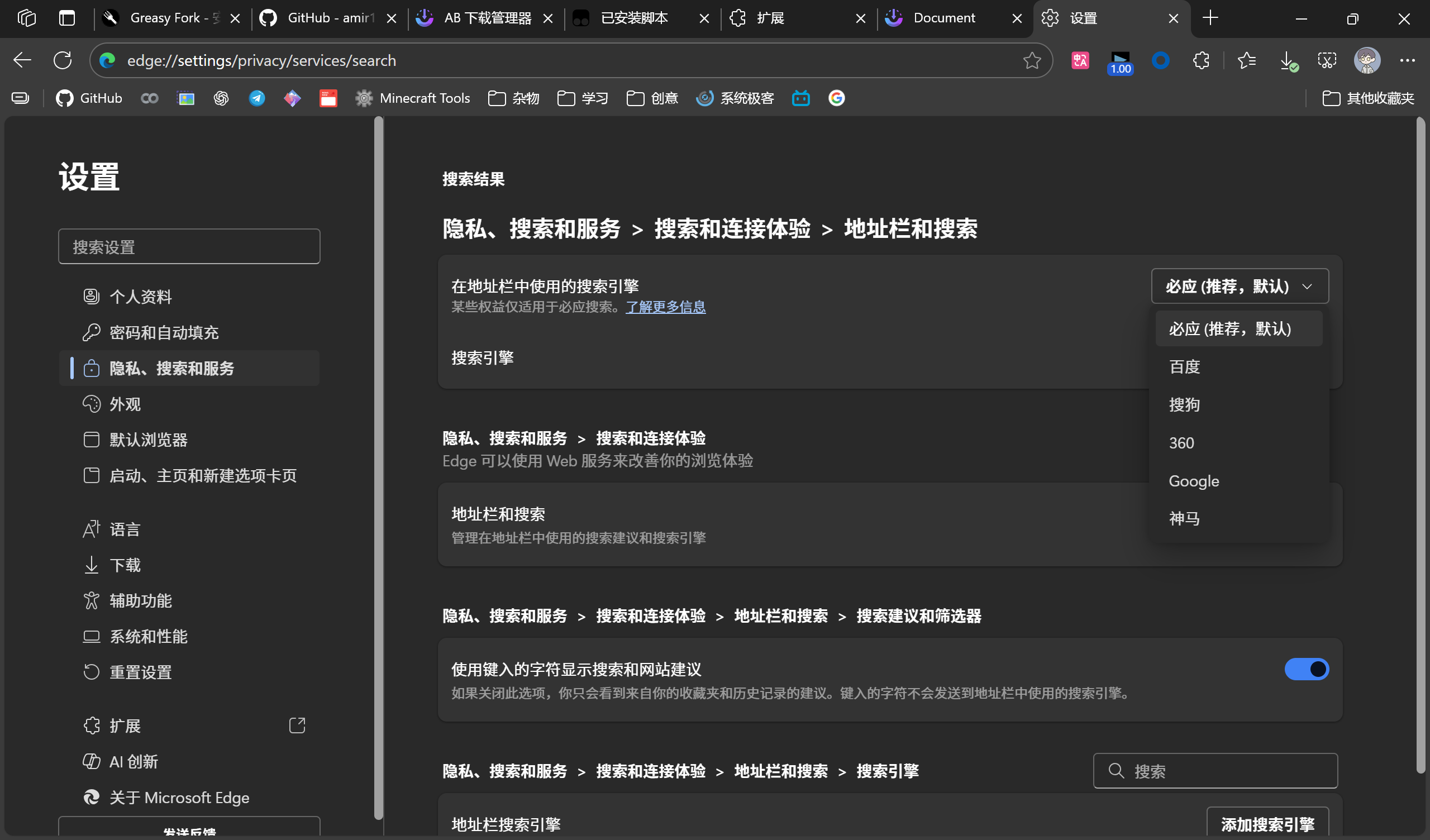 对于 Edge 浏览器,复制粘贴 edge://settings/privacy/services/search 到地址栏并回车即可开始配置你的搜索引擎。