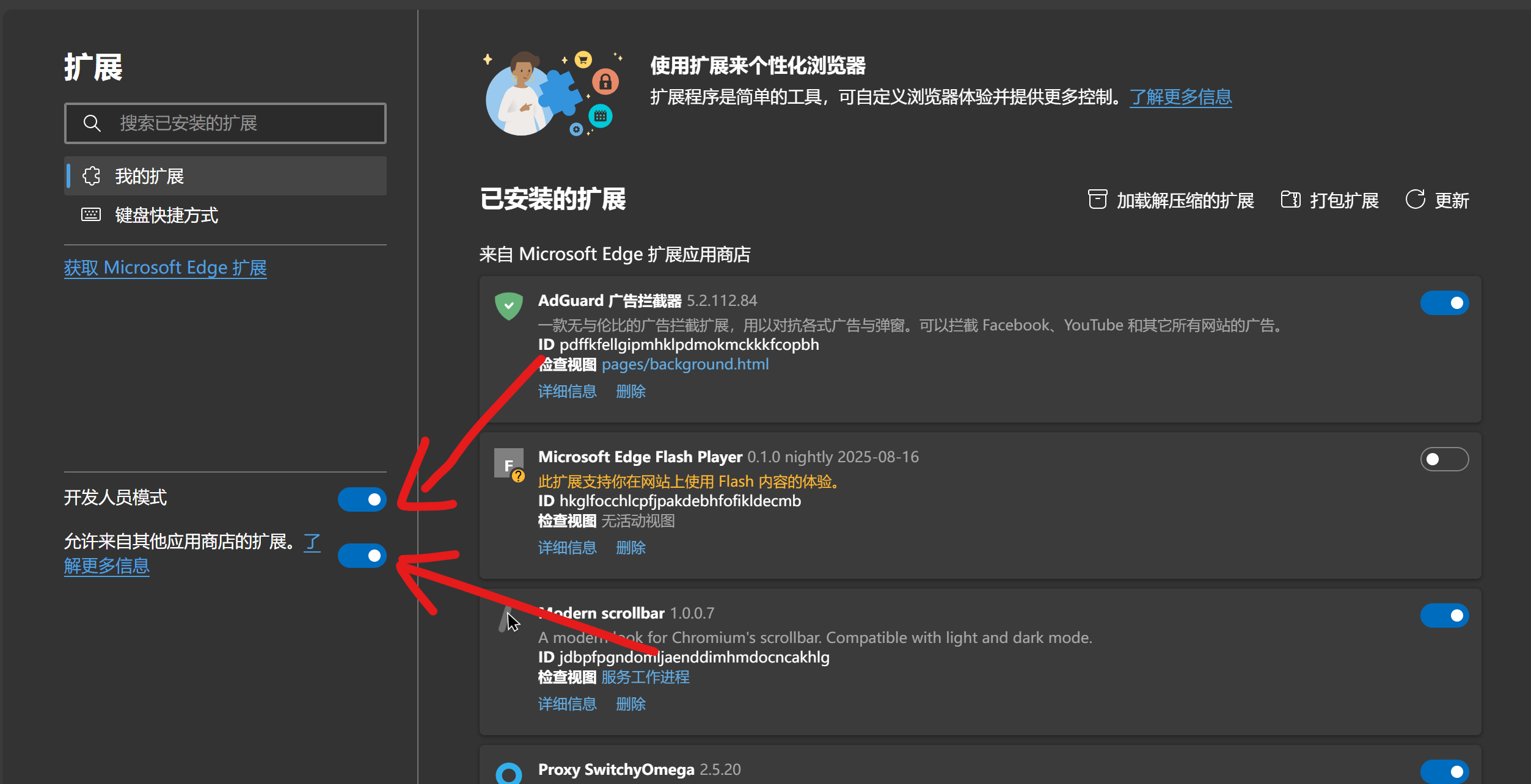 随后,让我们进入 Edge 的设置页,打开开发者模式让该插件解锁全部潜力: