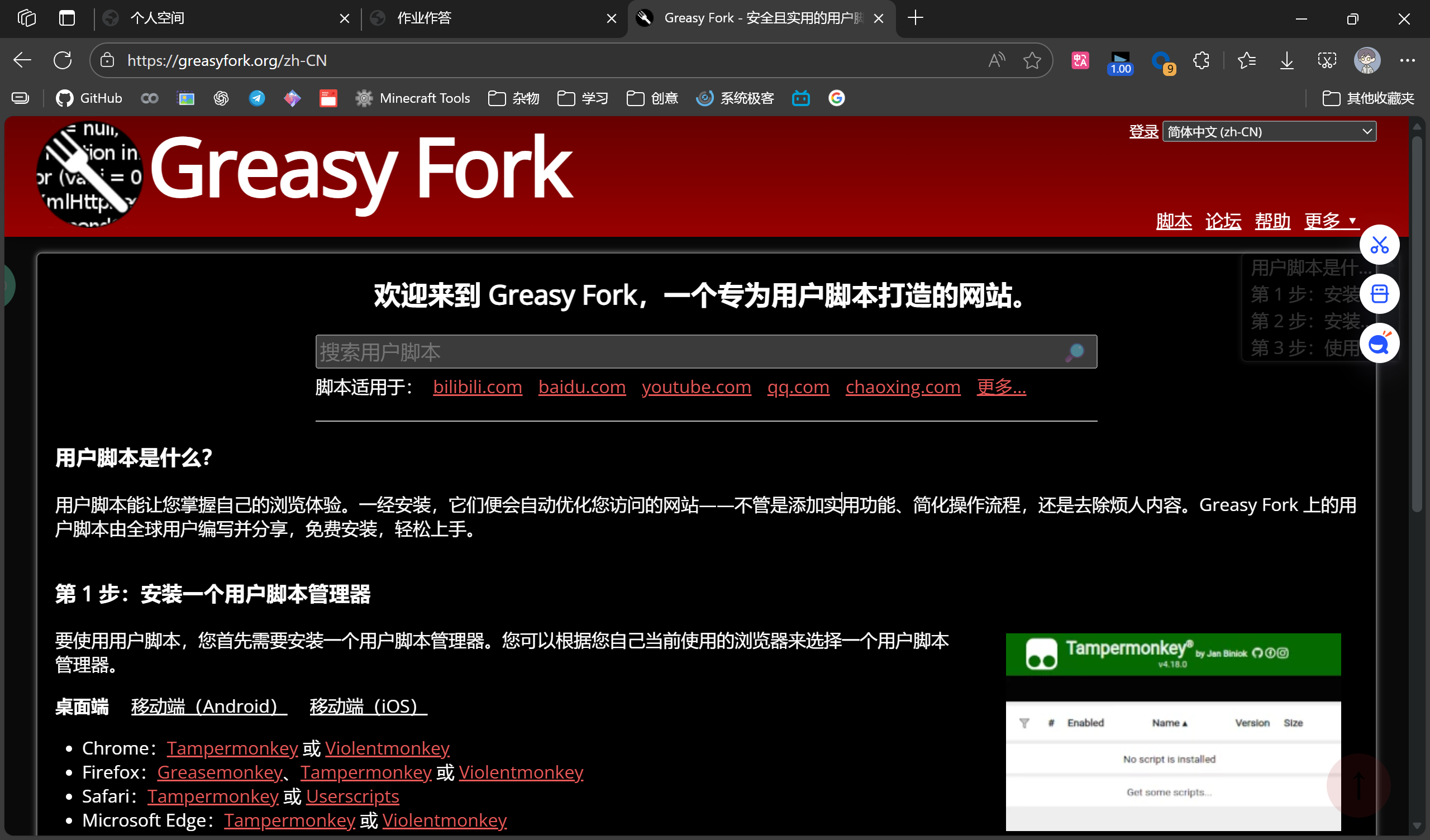 进入通常情况下最常用的脚本网站 GreasyFork (油叉) 。