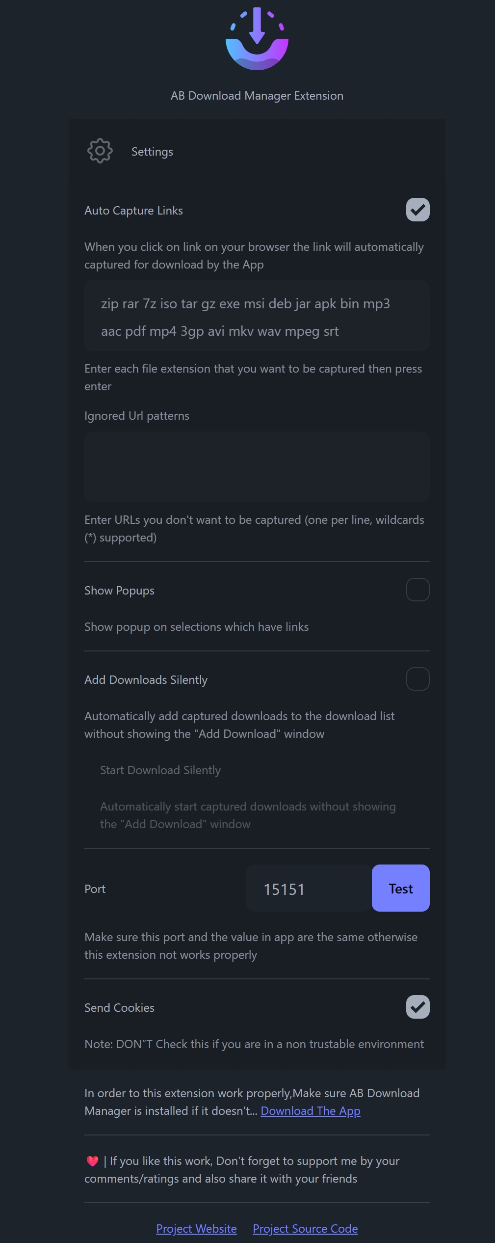 注意,通常不需要用那一堆文件扩展名,只需要打开 Auto Capture Links 和 Send Cookies,然后关闭 Show Popups 即可。